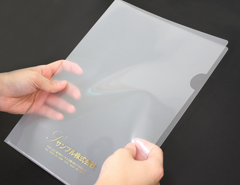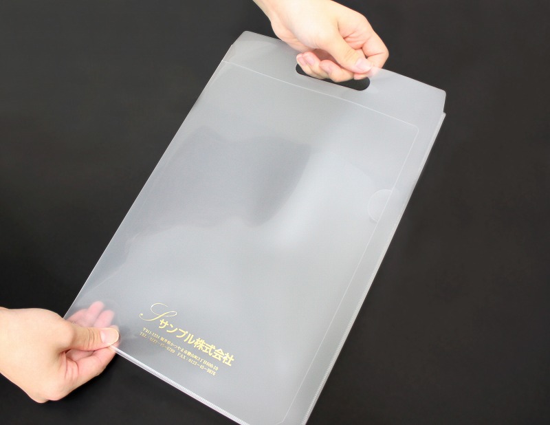 このクリアファイルバッグに社名などの名入れ箔押し印刷で、インパクトのあるバッグにしてみましょう。