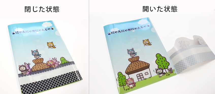 スタンダードなクリアファイルから少し変えて変わった見せ方をしたい方やよりデザイン性をあげたクリアファイルにしたい・・・付加価値を上げたい方にオススメです。