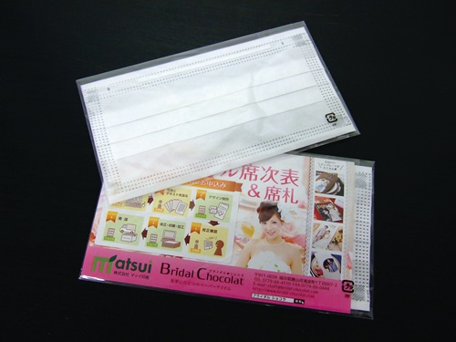 マスクをノベルティで配るという場合には、ポケットティッシュのようにマスクとチラシ(オリジナルラベル)をサイドポケットの付いているビニール袋に入れます。