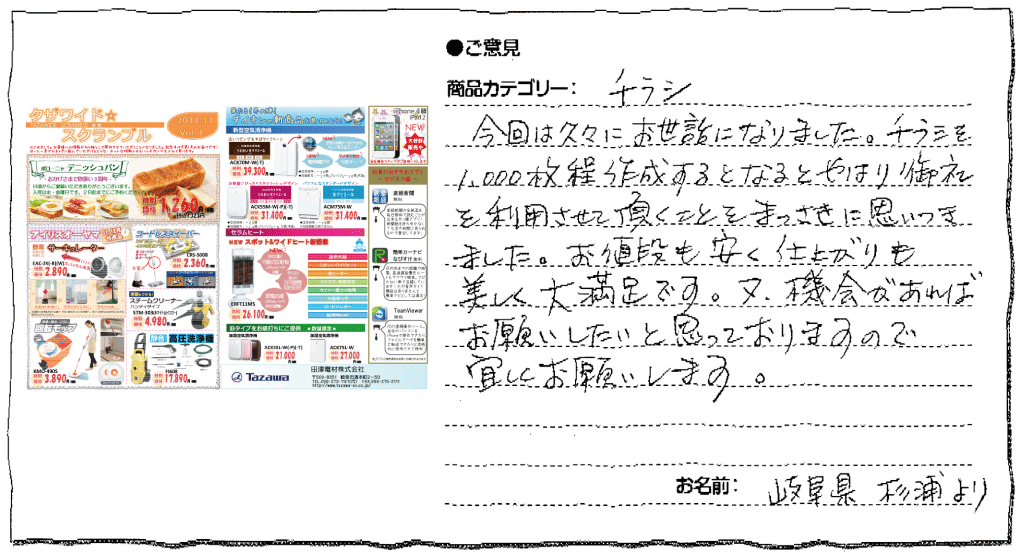 今回は久々にお世話になりました。チラシを1,000枚程作成するとなるとやっぱり御社を利用させて頂くことをまっさきに思いつきました。お値段も安く、仕上がりも美しく大満足です。