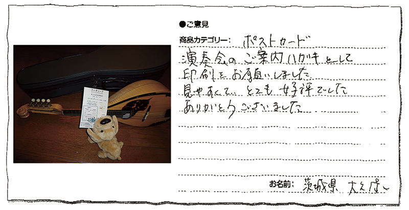 少しくらいの印刷なら自分でできる自信があり、今までもやってきて、評判は決して悪くなかったので、やってもらえるという「楽」以外に特に期待はしていなかったけれど、結果として、仕上がりの色や文字の鮮明さに発注してよかったと思っています。