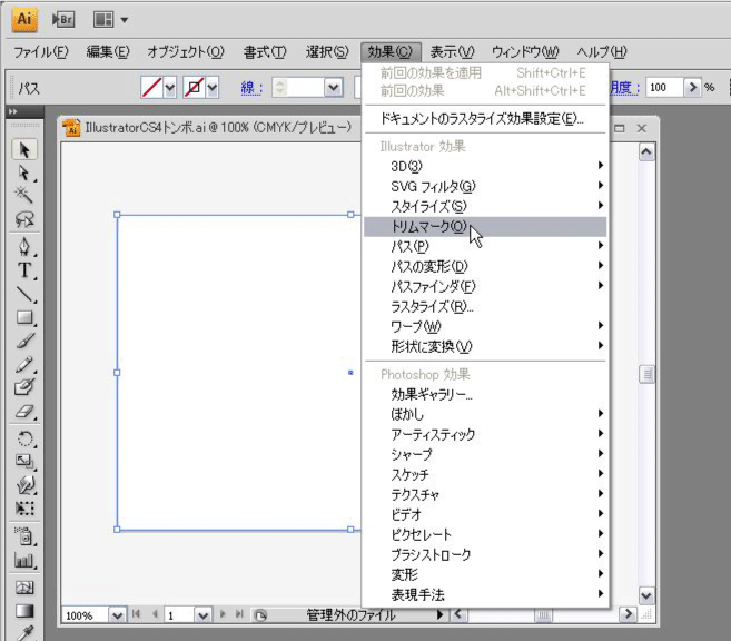 2)作成した長方形(四角)を選択した状態で、[効果]→[トリムマーク]を選択します。