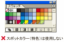 スポットカラー・特色などは使用せず、したとしても最後に必ずプロセスカラー(CMYK)に変換して下さい。