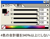カラーで黒を表現する方法は二通りあります。一つはK100%の黒。もう一つはリッチブラックと言われるクロです。リッチブラックにすると、黒に深みが出て綺麗に仕上がります。ただ、使用したCMYKの合計が340%以内になるように設定して下さい。それ以上になりますと汚れの原因になり、これはファイルチェックの対象外となりますのでお気をつけ下さい。