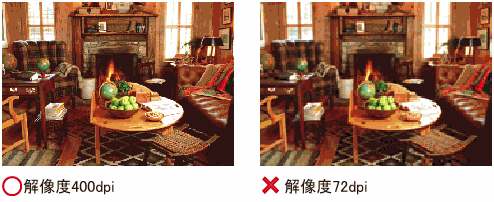 解像度が72dpiしかなくても、画面では綺麗に見えます。Webに使用されている画像もほとんどが72dpiしかありません。低解像度のものを印刷すると、粗いガタガタとした仕上がりとなってしまいます。