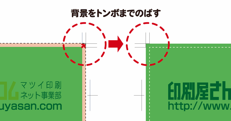 いわゆる「塗り足し」と言われるもので、印刷物を断裁する時、断裁時のズレにより「白」が入るのを防ぐものです。