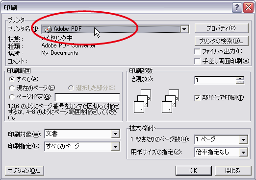 2.「プリンタ名」から「Adobe PDF」を選択し、OKをクリックし、PDFを書き出します。